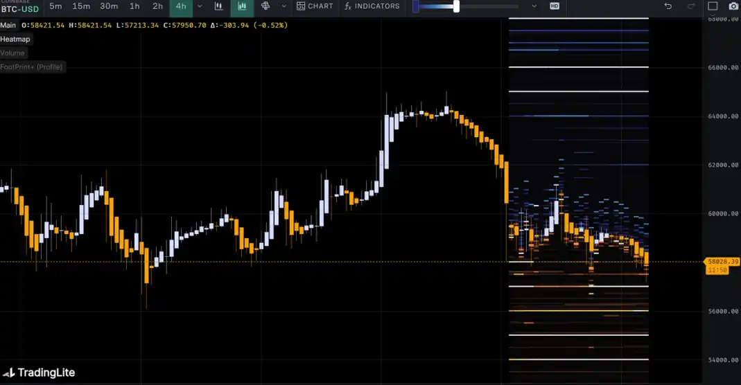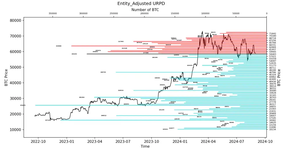 观察筹码分布图,在约 59000 附近有大量筹码成交,将有⼀定的支撑或压力。