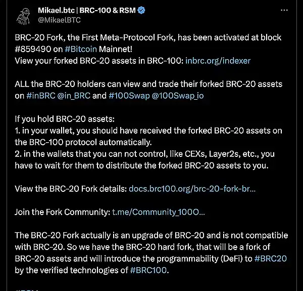 ● BRC-20 Fork,第一个元协议分叉,已在 Bitcoin 主网上的 #859490 区块激活!如果您持有 BRC-20 资产,在您的钱包中,您应该已经自动收到了 BRC-100 协议上的分叉 BRC-20 资产。在您无法控制的钱包中,如 CEX、Layer2s 等,您必须等待他们将分叉的 BRC-20 资产分发给您。by @MikaelBTC