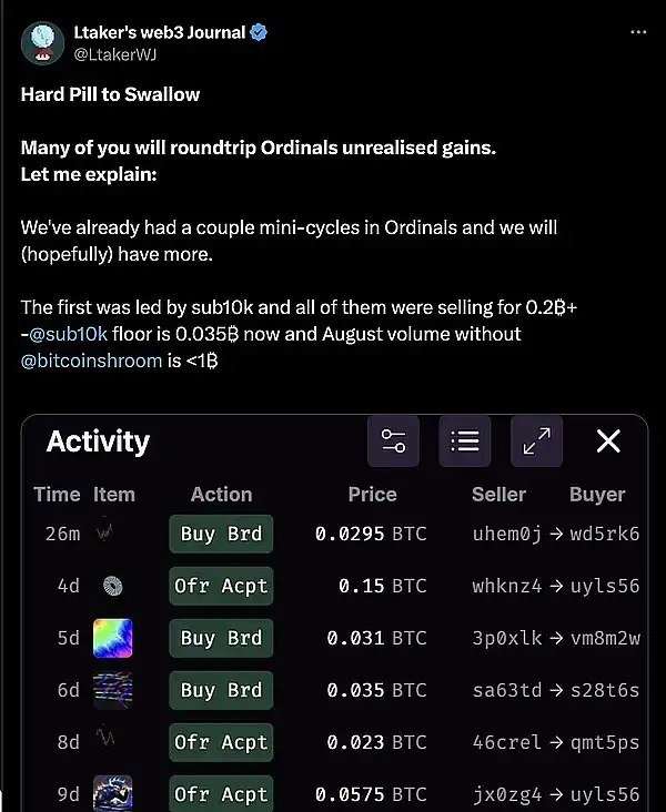 ● 节点猴最高 0.9 BTC 下跌 86%,木偶最高 0.47 BTC 下跌 83%,OMB 最高 1.5b 下跌 72%-89%,量子猫最高 0.47 BTC 下跌 50%。总结经验作者 @LtakerWJ 认为,应选择持久力和适应性强(包括不同类型客户受众)的项目。