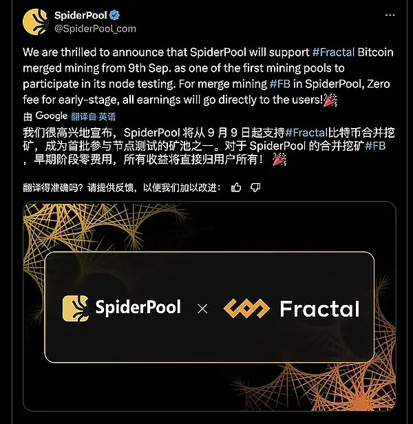 ● SpiderPool @SpiderPool_com 将从 9 月 9 日起支持 #Fractal 比特币合并挖矿,成为首批参与节点测试的矿池之一。对于 SpiderPool 的合并挖矿 #FB,早期阶段零费用,所有收益将直接归用户所有。