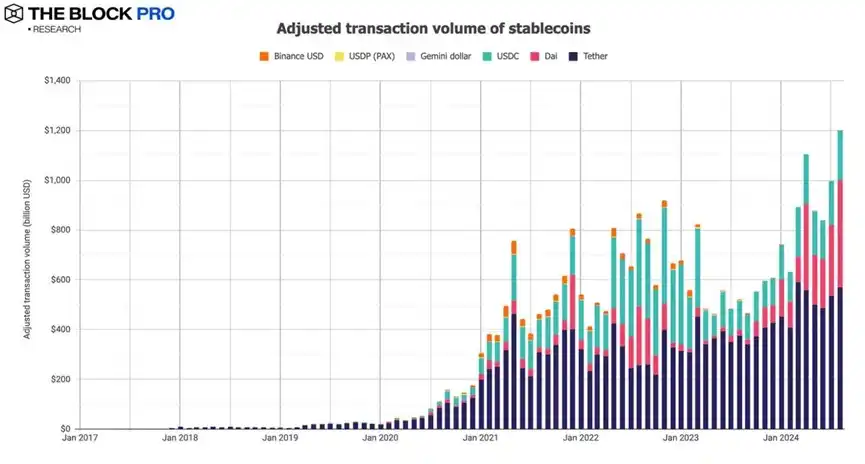2、八月调整后的稳定币链上交易额增长 20.5%,达到 1.2 万亿美元,稳定币发行供应量增长 2.9%,升至 1484 亿美元,其中 USDT 和 USDC 的市场份额分别为 78.7% 和 17.4%。