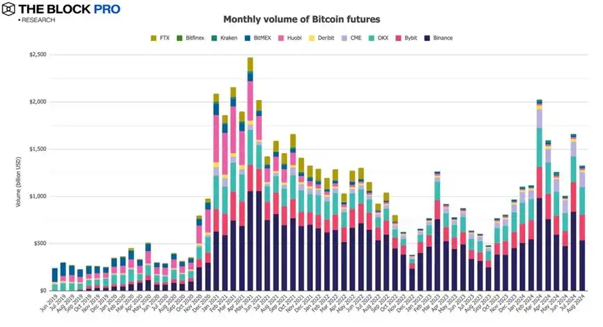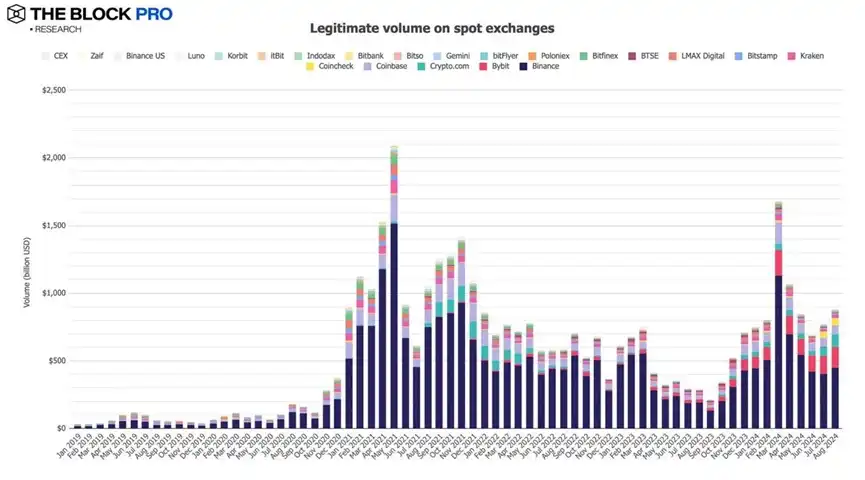 6、合规中心化交易所(CEX)的现货交易额在八月份有所增长,增幅达到 13.7% 升至 8775 亿美元。