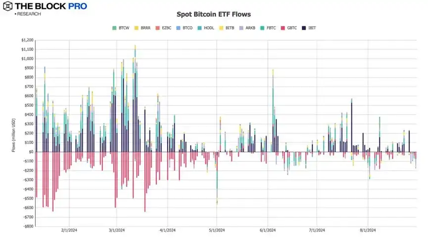 7、八月现货比特币 ETF 净流入量出现负增长,流出金额约为 4.221 亿美元。