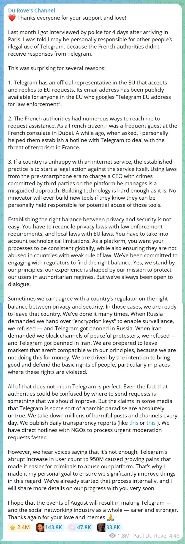 在近一周的沉寂后,Durov 于今早首度在其官方个人频道发文回应巴黎拘留风波,以下是其声明全文: