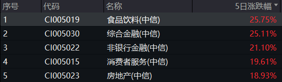 值得注意的是,近几日,吃喝板块表现显著占优。Wind数据显示,截至今日13:20,近5日,食品饮料板块涨幅已超过25%,涨幅在30个中信一级行业中高居首位。