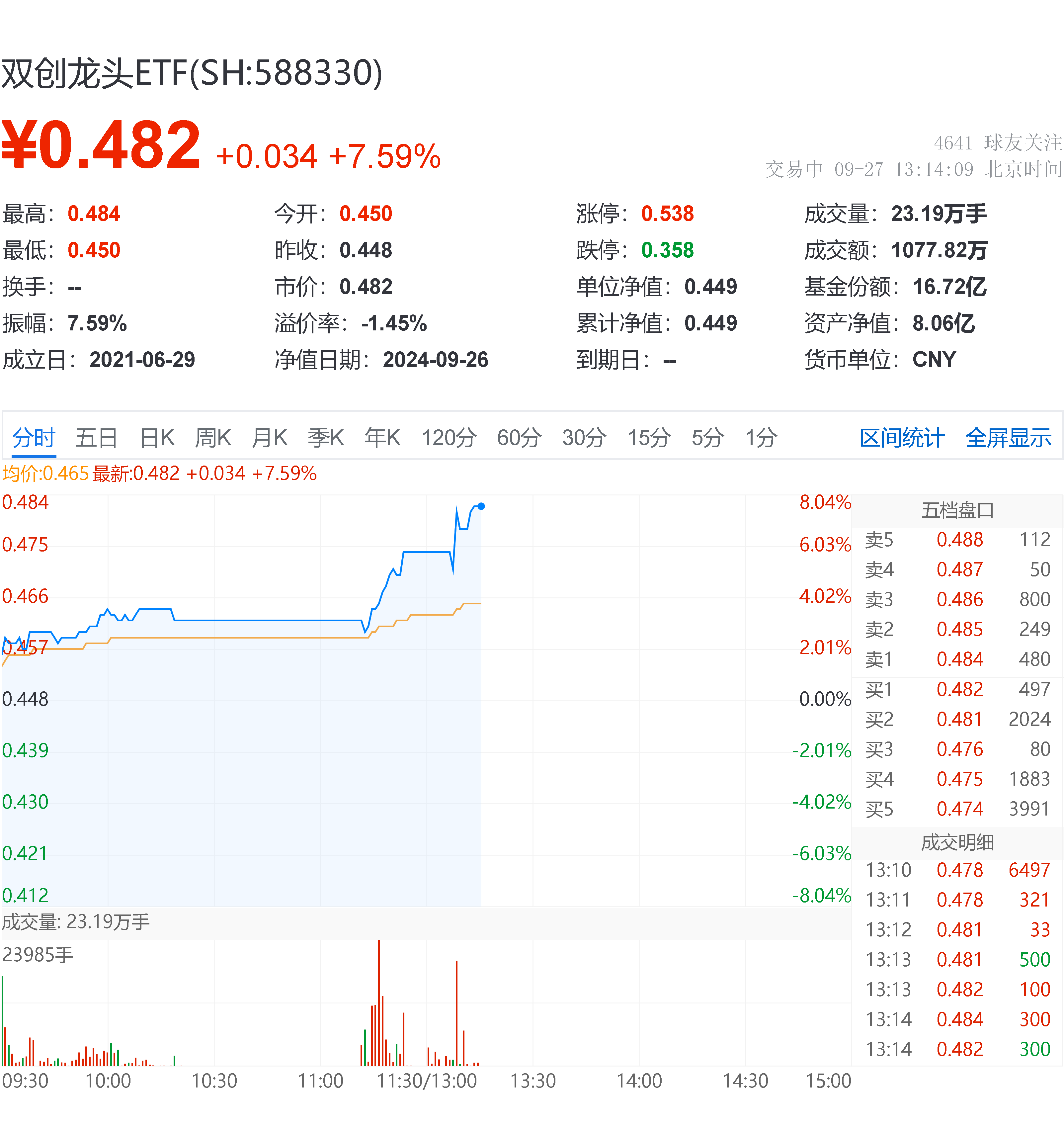 涨疯了!今日(9月27日),创业板指涨超11%,创历史最大涨幅!科创50指数亦涨超7%,覆盖创业板和科创板龙头个股的双创龙头ETF(588330)临近中午快速发力猛攻,场内价格现涨7.59%!