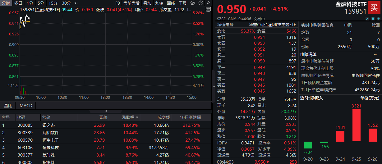 金融科技ETF盘中资讯|恒生电子涨停,恒银科技五连板,金融科技ETF(159851)放量上攻5%!机构:金融IT是指数反弹先锋