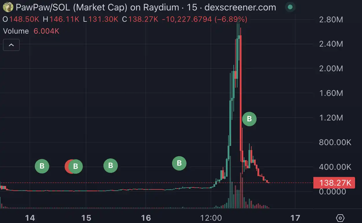 但在市值接近 280 万美元后,pawpaw 出现断崖式下跌,15 分钟跌幅 73%,由于被社区发现的 HnRi7 地址并没有卖出动作,pawpaw 的下跌让许多交易者遭受亏损。