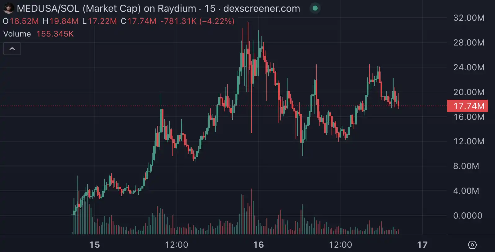 MEDUSA 上线后涨幅超 50 倍,市值在昨日晚间最高突破 3000 万美元后开始下跌,截至撰稿时为 1774 万美元。在今日有两次涨幅在 100% 左右的震荡过程。