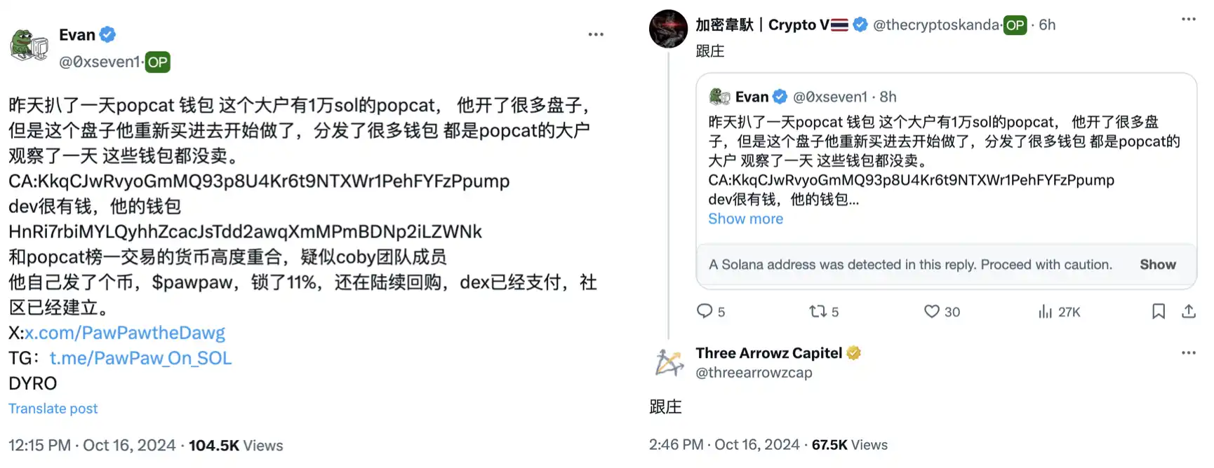 10 月 12 日,meme 币 popcat 市值突破 15 亿美元。今日,有玩家 @0xseven1 发现 popcat 前排钱包 HnRi7 开头的地址发布了新的 meme 币 pawpaw。随后,中文社区 KOL 加密韋馱和三箭资本官方账号 Three Arrowz Capitel 都评论了这条推文。自今日上午 11 时至 15 时,pawpaw 涨幅超 40 倍,交易量超 200 万美元。