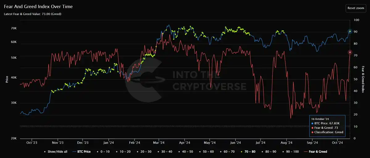 而从恐惧贪婪指数来看,恐惧贪婪指数自 7 月 29 日以来,首次突破 70,来到「贪婪」状态。