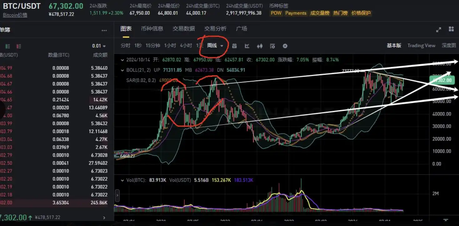 从日线延升周线,目前周线还在整理通道类压力拐点区域并没有突破如图三:周线 BTC 还在三角区域有压制,周线在三角压力区域只有两种走势。