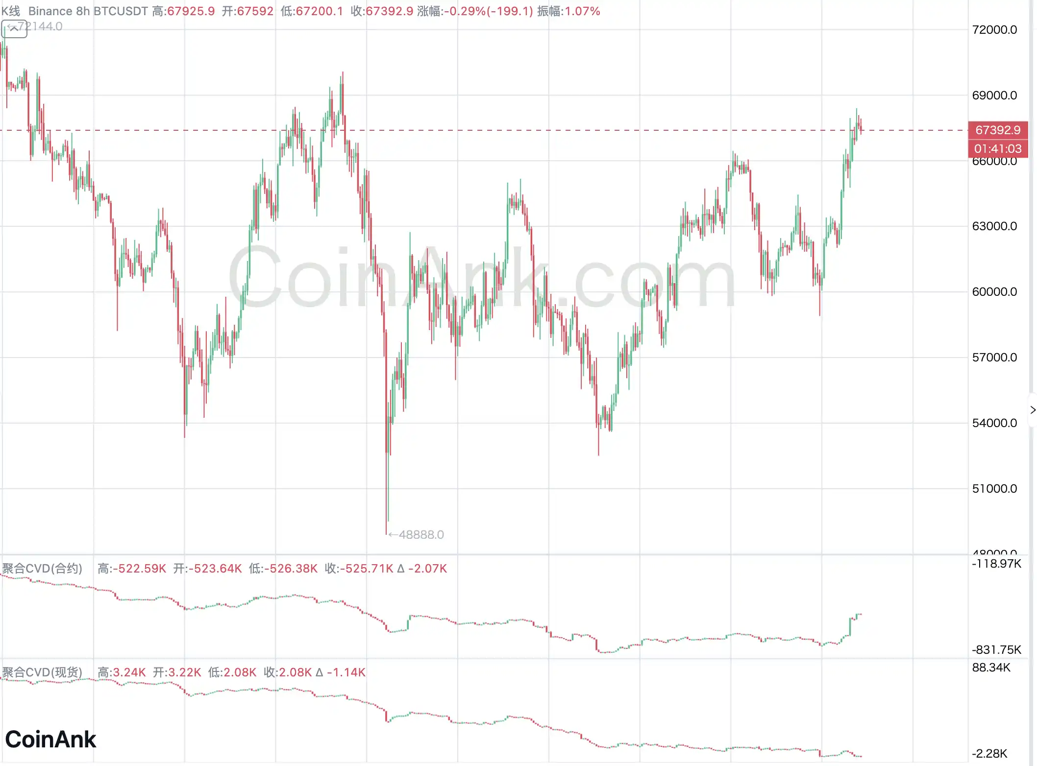 观察到 Coinbase BTCUSD 现货与 USDT 的负溢价状态已经持续 16 天了,可以确认:首先 USDT 在这 16 天里,总体处于负溢价状态,代表稳定币市场有部分资金流出;其次 Coinbase 现货市场在这 16 天里始终在出货;而且期货市场买盘一直很强,是价格的推动方。需要确认下方是否有现货买盘的跟进,期货主导的多头趋势是迅速的,接下来迅速捅破 69000 或 70000 是完全有可能的,如果没有现货买盘的跟进,迟早还会出现针对多头流动性清算的巨大下影线。