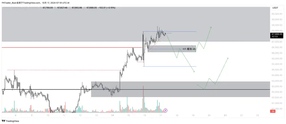 小时级别:10 月 15 日做了上下插针吸盘后,向上再次做了掠夺,如果要做空,安全一点的话,需要关注对 H1 看涨 ob 测试,这里实体跌破,回踩才是做空机会;行情依然是上涨趋势,这里先看对 idm 掠夺后测试 H1 看涨 ob 吸筹买入机会;如果跌破 H1 看涨 ob,那期待走我们一致预期的回调,关注掠夺 64500美元(短线)蓝色 range—L 后吸筹买入机会,和重点关注H4看涨 ob 63,000美元附近吸筹买入机会。