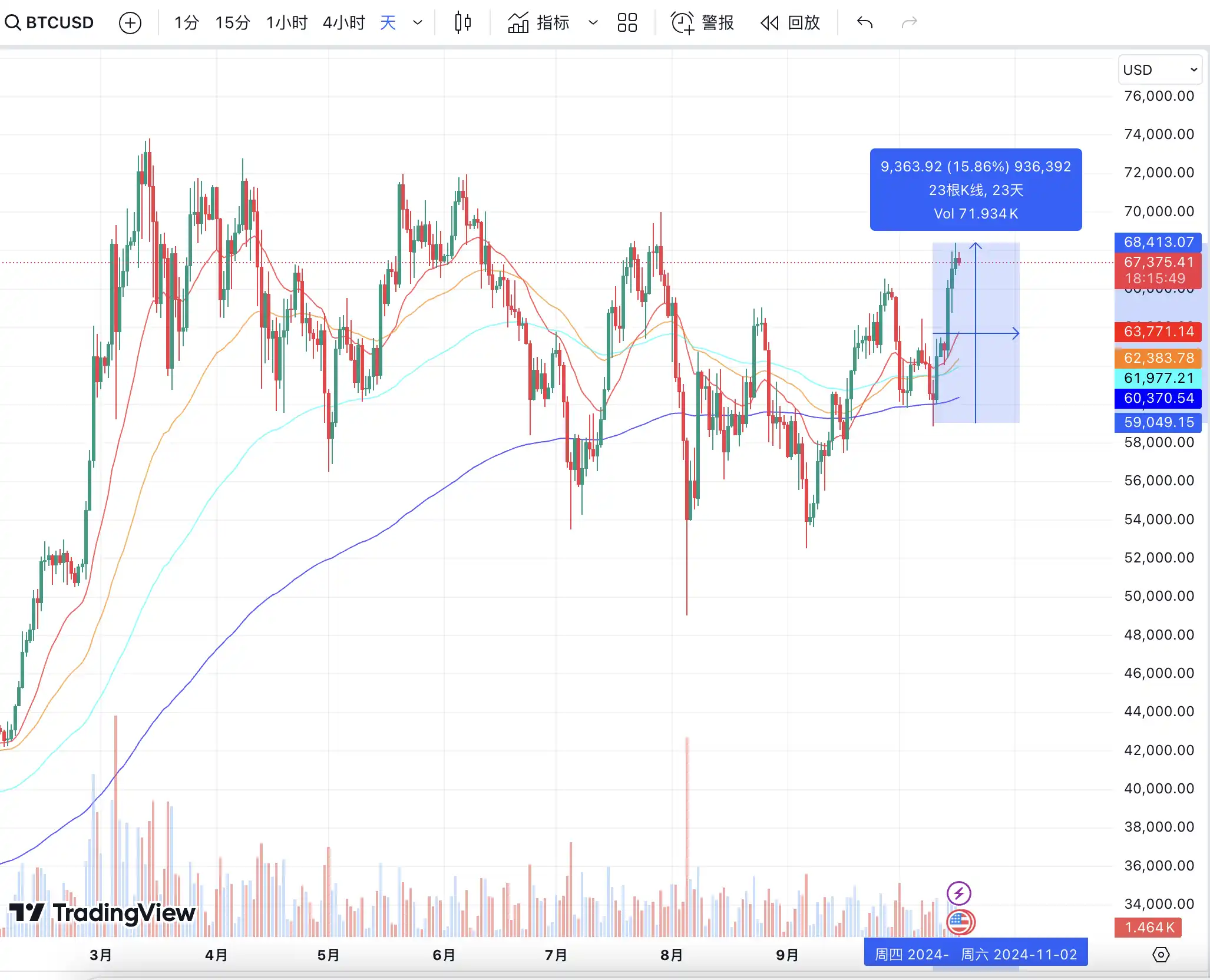 日线压力区 68600 周线压制线在 71600 左右