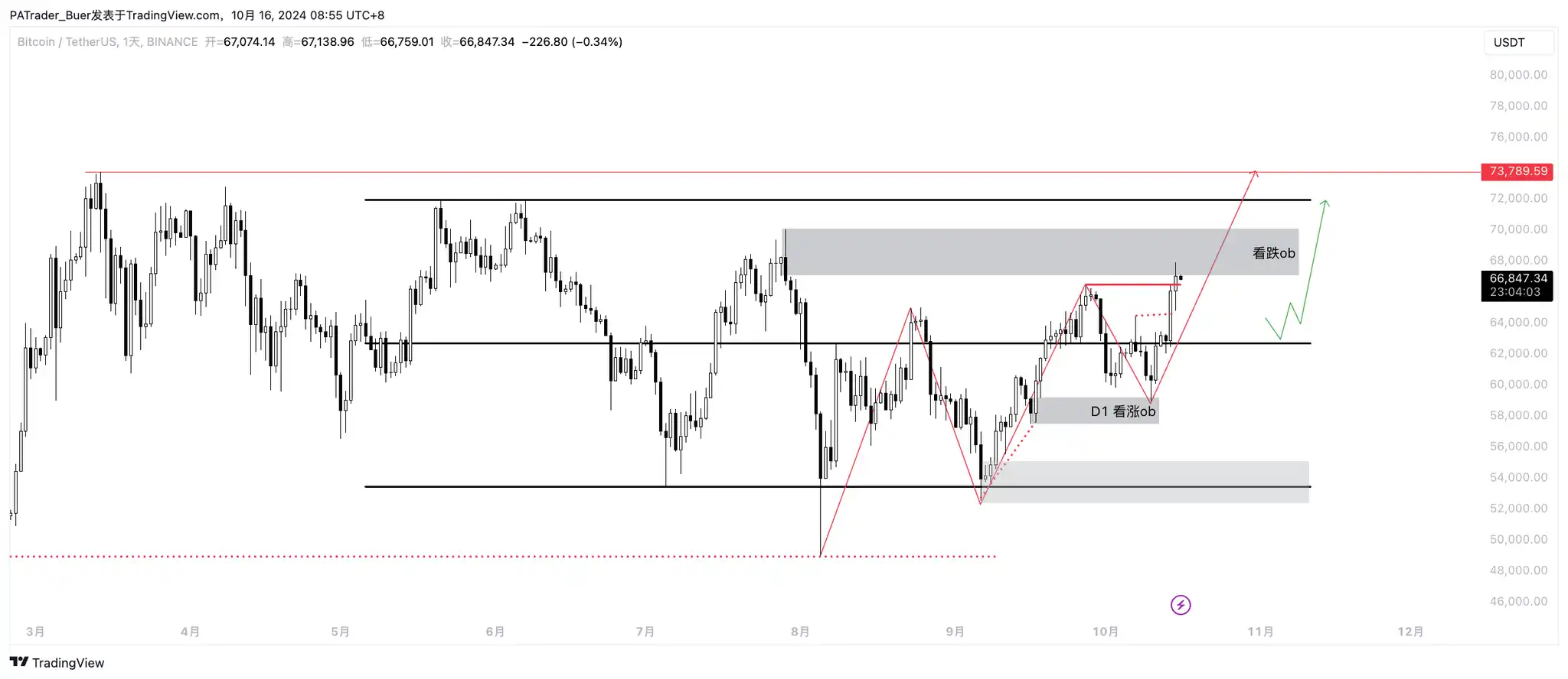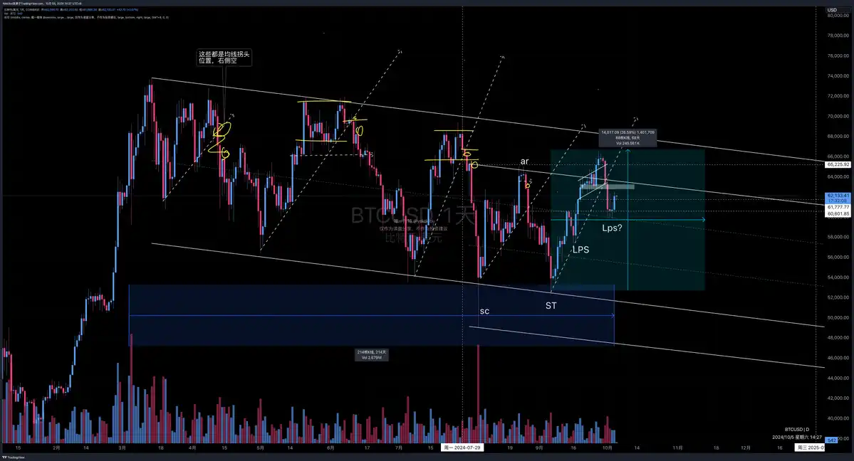 日线级别:上涨行情已经走出来了,10 月月报说的 5w9 的位置就是最后的上车位置;还是继续关注看跌 ob 测试,是直接突破打 range-H 还是拒绝向下派发回踩了;回踩关注位置 依然是 64500 和 63,000美元,回踩就是买入位置。现货挂单重点依然是 63,000美元。