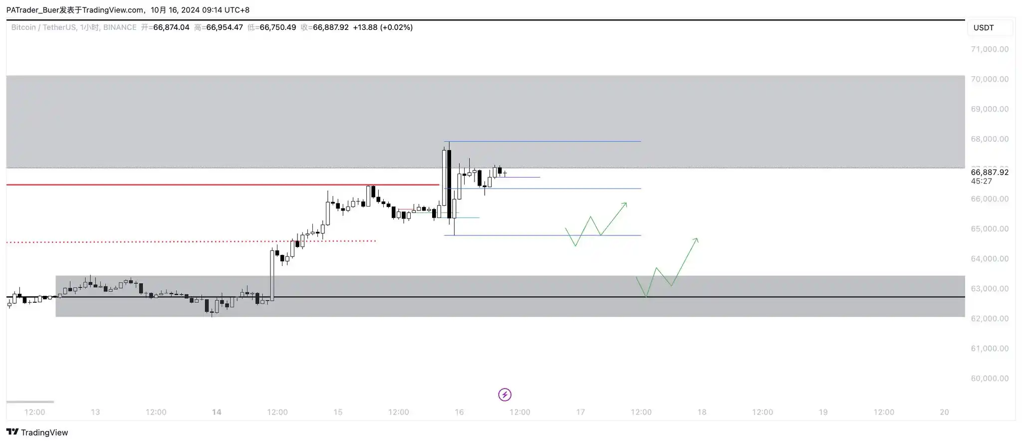 目前结构从 5B 触底以来震荡上升,资金累计叠加!目前价格 67000 突破日线前高点 66500 的压力进入次二通道轨迹图,如下图一:红色通道为震荡下行整理,白色通道为次二通道轨迹从红色整理通道刚走出新的空间!短期持续顺势看涨为主,但从次二通道看目前处于 B 的拐点位置,也就是新的三浪结构第一浪脱离前整理区间,第二浪抬高。目前处于次二通道的 B 拐位置。