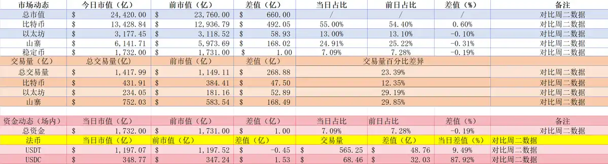 而在资金方面,场内稳定币的市值增长 1 亿美金,目前 1732 亿美金:USDT:官网数据 1197.66 亿,对比昨日并不变化,亚欧资金暂时停止资金流入,不过现有存量依旧足够。交易量依旧持续增加,亚欧资金活跃度不错;USDC:数据网址显示市值增长 1.53 亿,交易量增加 87.92%,明显看出美区资金开始回流,并且积极参与到交易中,美区时间恢复往日的活跃状态。