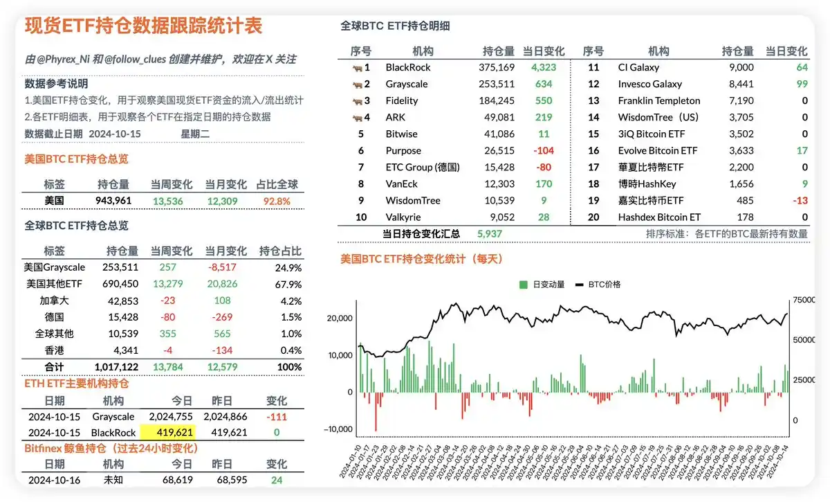 认为短期 BTC 的上涨与 BTC ETF 的购买力相关性比较强,在 10 月 15 日这个交易日中直接净流入 4,323 枚 BTC,这个数据带来的流入资金就接近了 3 亿美元,把最近几天 BTC 的上涨和贝莱德财报关联到一起,可以明显的看到在贝莱德财报利好的刺激下,对于 #BTC 的购买力有了很大的提升,对于 BTC 的价格也有相当的支持。