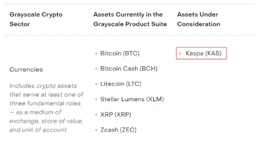 灰度(Grayscale)发布正在考虑纳入未来灰度投资产品的加密资产列表和已发布产品的加密资产列表,分为货币、智能合约平台、金融、消费者与文化、公用事业与服务几个类别。其中灰度正在考虑纳入未来灰度投资产品的加密资产包括:Kaspa (KAS)。