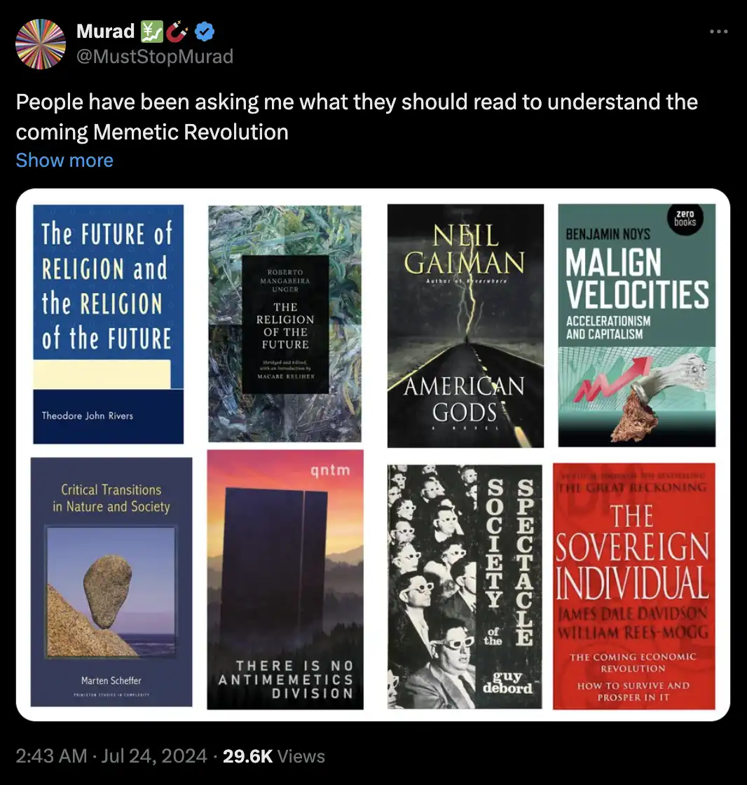 那这套理论是源自于何处呢?我们可以从他的 meme 书单窥见一二,推荐也想系统性研究 meme 文化的人看看。
