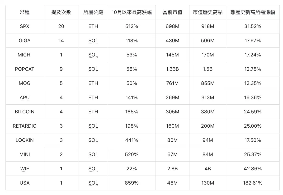 喊单风格:喜爱邪教风格迷因币,当中 SPX 被提及最多次,再来则是 GIGA、POPCAT。Murad 推荐的迷因币市值大多落在 300M~1.5B 之间,比较少喊单小市值土狗。基本上当前价格距离历史新高所需涨幅较少,代表迷因币的回彻幅度较小。