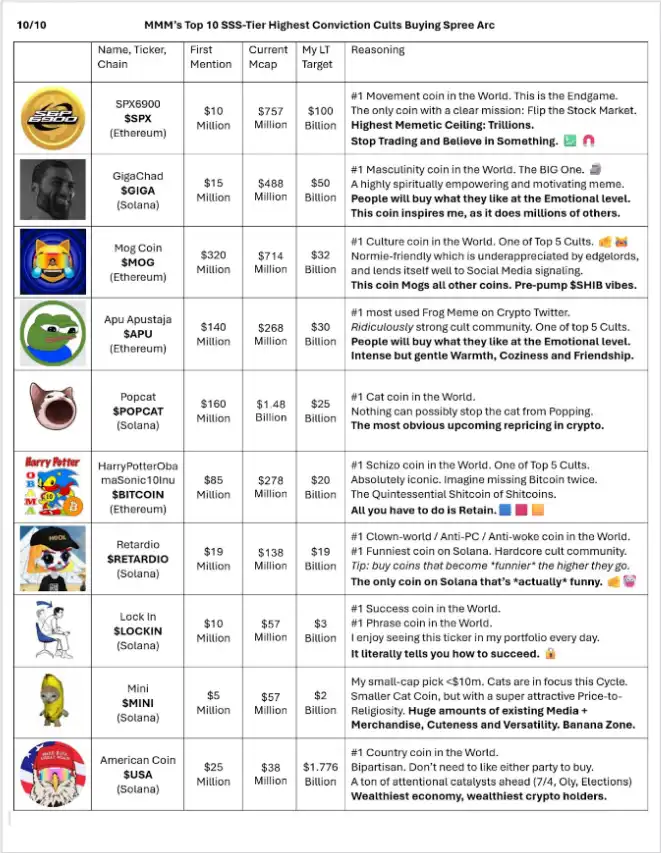 迷因币在这周期一直不断被提及,也是最强势上涨的赛道,而近期 KOL Murad 在 TOKEN2049 大会上发表了关于迷因币超级周期的演讲,他认为还有 8 到 14 个月的迷因狂潮,并且发布自己看好的迷因币种列表,,并且疯狂喊单。当中他最看好的 SPX 在他首次买入时市值仅约 1000 万美元,当前市值约为 7 亿 5000 万美元,浮盈高达 830 万美元,也因此成为新一代迷因币之神