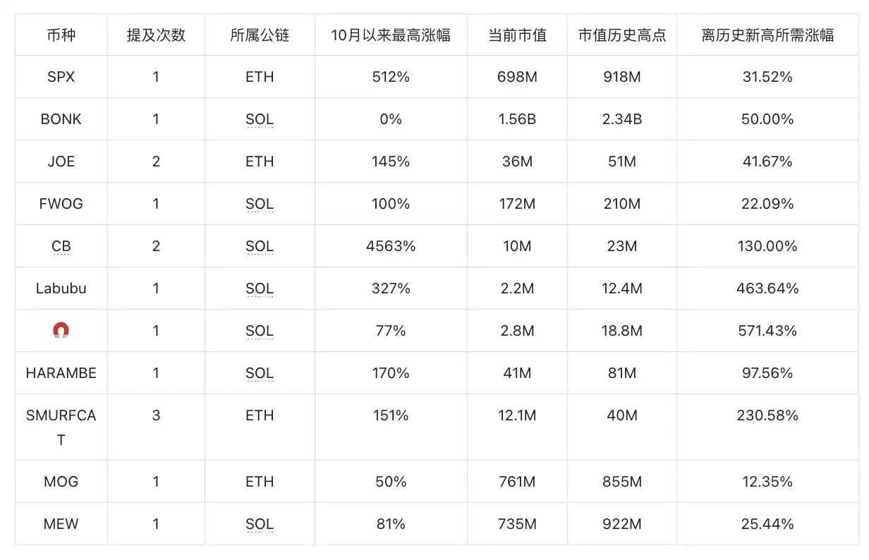 简介:链上 Degen 玩家,Telegram 频道高达 8 万多人追踪,主要发送及时 1.5 级迷因币 Call 讯,由于 Telegram 发送频率高且多为小市值币种,以下统计为推特提及,不计算 Telegram 喊单。当中 CB、LABUBU、 为 10 月后发币项目,涨幅计算方式为第一天的收盘价为基准。