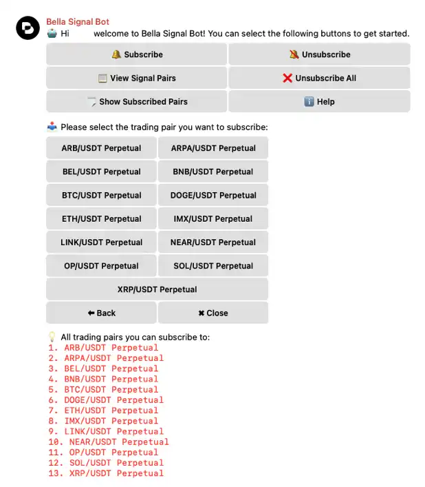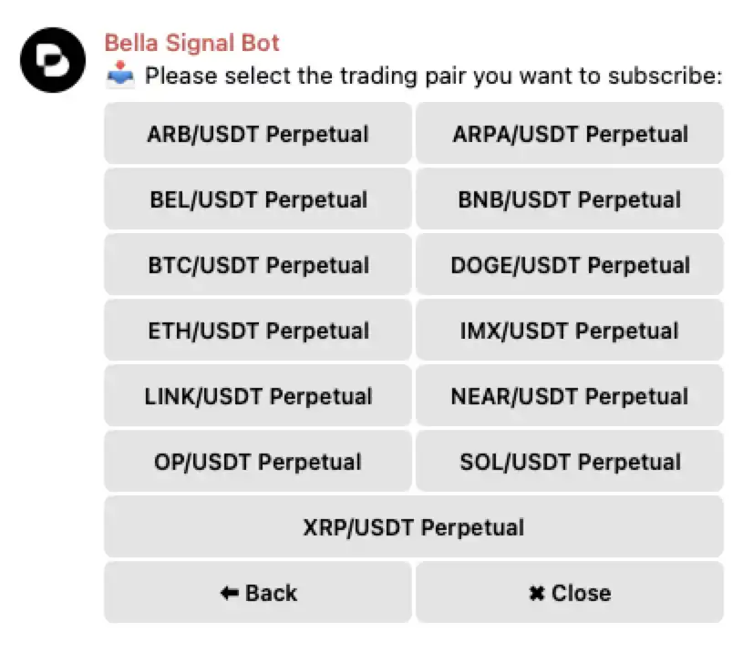 从 TG 进入 Bella Signal Bot 后,可以看到 Bot 的几个功能,以及当前可以交易的交易对、交易币种。(我们在后面将详细介绍)