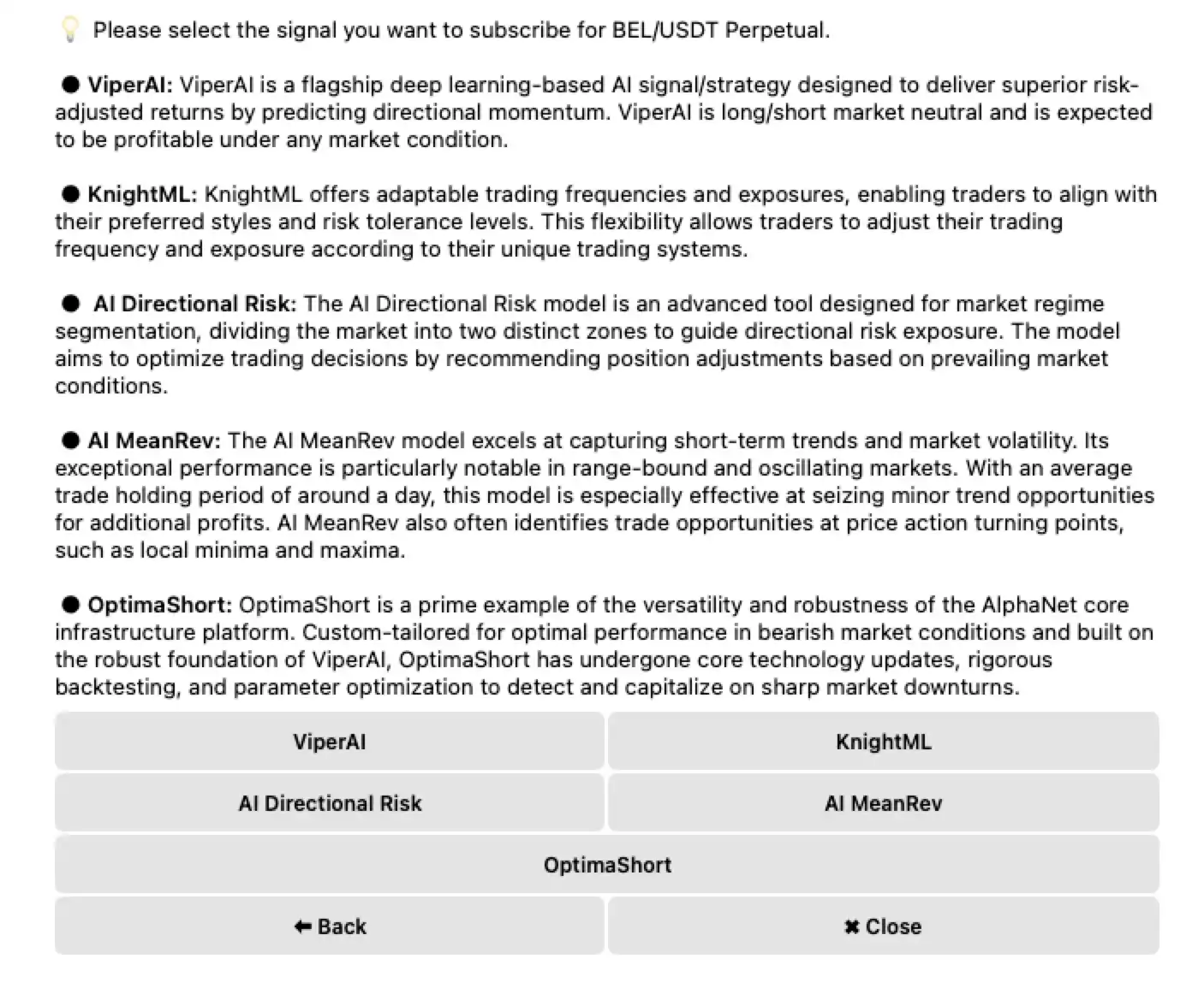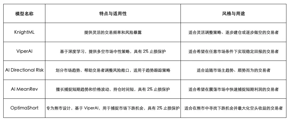 不过特别的是,Bella Signal Bot 由五种的人工智能模型提供支持,由此也就衍生出了 5 大不同的交易风格,分别是 KnightML、ViperAI、AI Directional Risk、AI MeanRev 和 OptimaShort。Bella Signal Bot 的五种 AI 模型介绍如下: