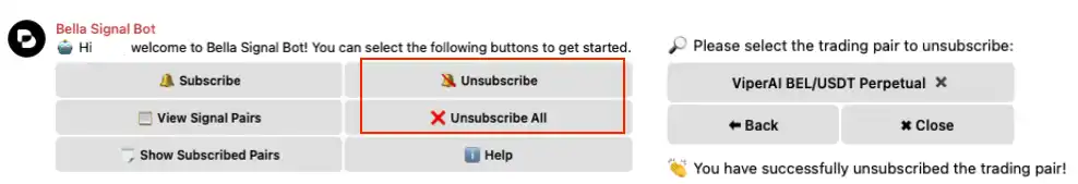 如果你想取消订阅某个特定的代币对,可以在主菜单中点击 Unsubscribe,或者在输入框中输入 /unsubscribe。在 代币对取消订阅菜单 中,点击想要取消的代币对。经过二次确认,一旦成功取消订阅,你将收到确认通知。