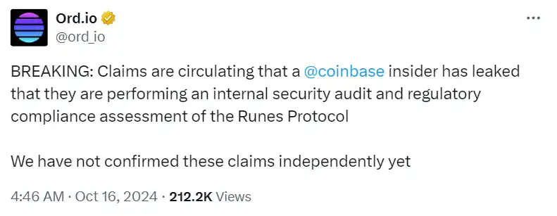 符文市场的几个龙头资产也都迎来了大幅上涨。PUPS•WORLD•PEACE 和 BILLION•DOLLAR•CAT 自 9 月底以来上涨了最高近 9 倍,DOG•GO•TO•THE•MOON 上涨了最高 1 倍。就在昨天,@ord_io 发表推文称有 Coinbase 的内部人士透露,Coinbase 正在对符文进行内部安全审计和监管合规性评估,但他们尚未独立证实这些传言。这不禁让大家对符文近段时间的上涨浮想联翩。