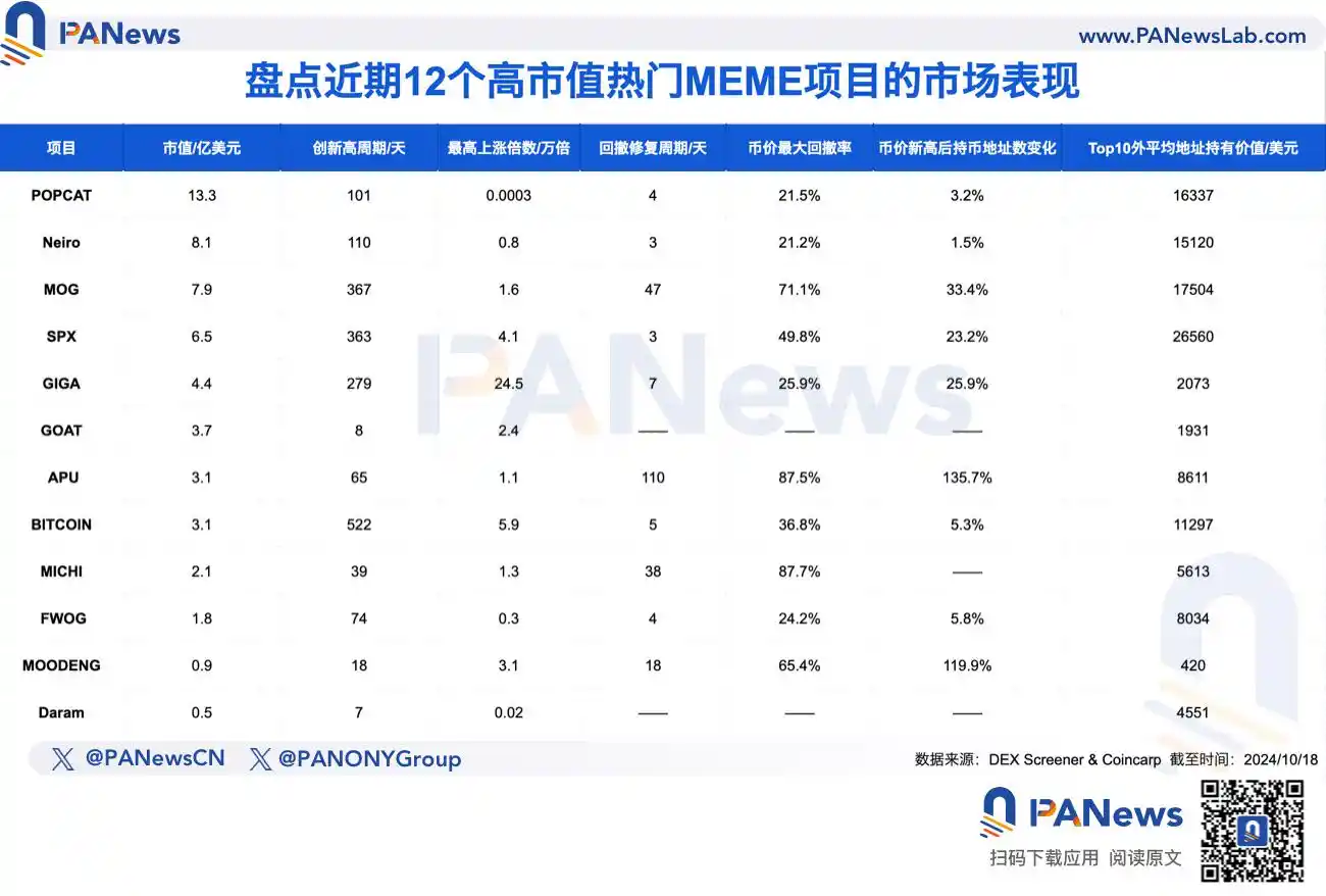 尽管在每日成千上万个新发射的 MEME 中,能成功跑出的 MEME 是少数幸存者,但是在成功上岸的 MEME 中,如何把握潜力股?龙头 MEME 崛起是否是偶然,又有何特性值得注意?为此,本文 PANews 梳理了近期以太坊和 Solana 上市值较高的 12 个热门 MEME 币及其市场表现(选取标的为各链中市值最高的同名项目,截至时间为 10 月 18 日)。