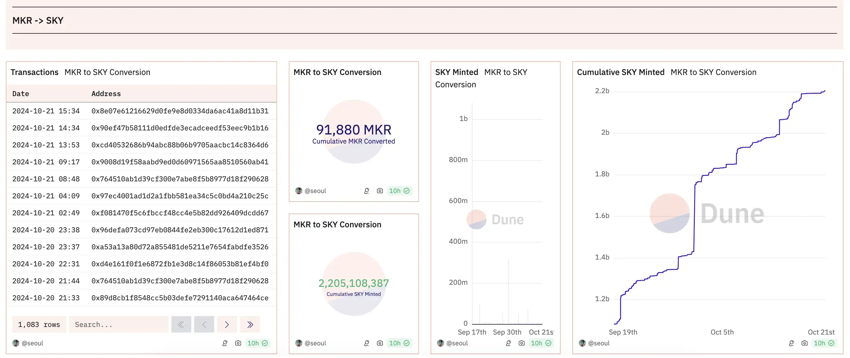 Dune 数据显示,截至发文约有 9 亿枚 DAI 已完成向 USDS 的迁移,仅占当前 DAI 总供应量(58 亿枚)的约 15.5% ;约有 91880 枚 MKR 已完成向 SKY 的迁移,仅占当前 MKR 流通供应量(868478 枚)的 10.6% 。