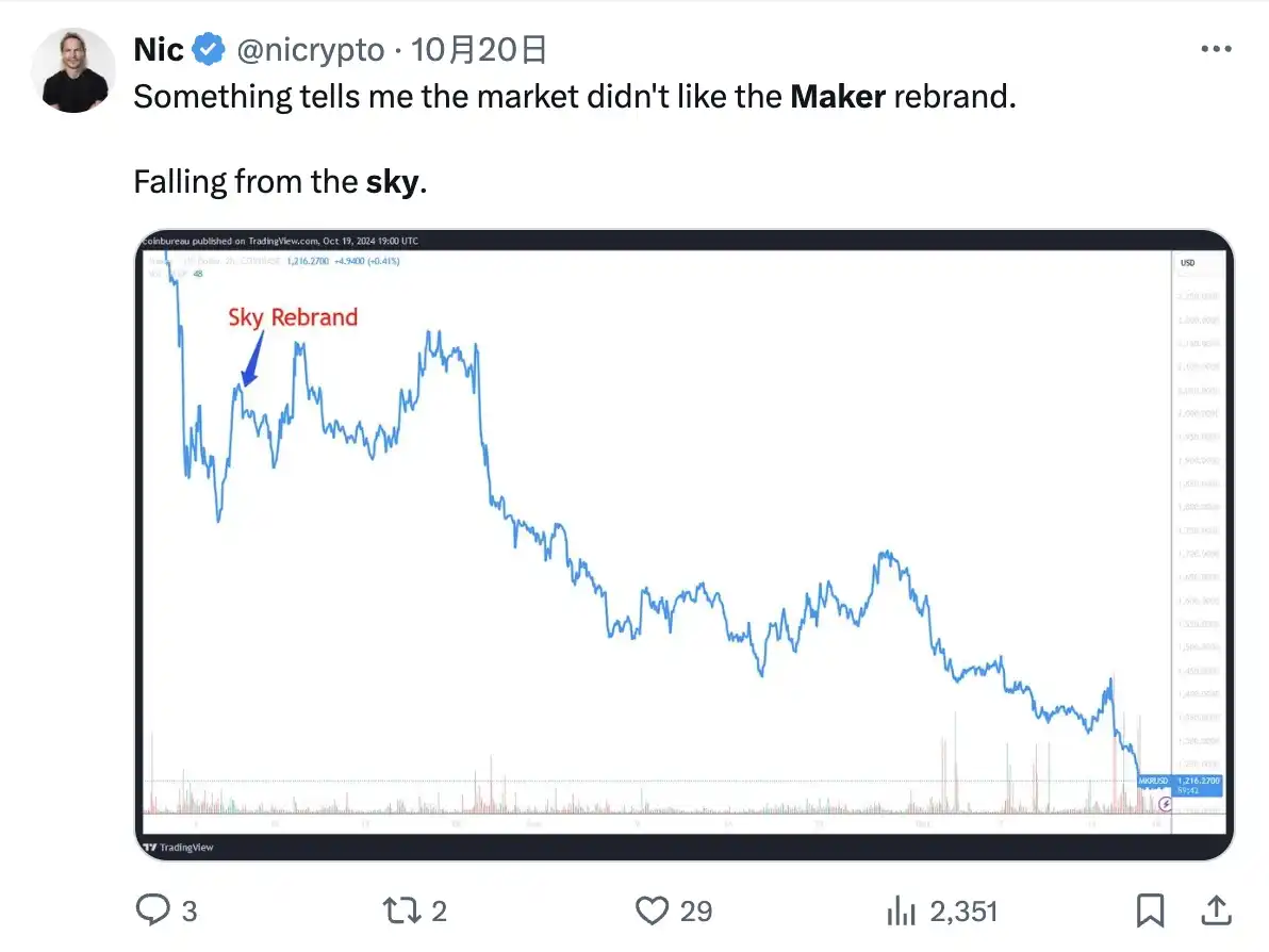 在谈及社区出现「信息混乱」之时,Rune 表示:「使用 Sky 作为协议、代币和前端的名称,确实增加了一些混乱。现在我们比以往任何时候都更清楚 DeFi 社区对 Maker 品牌的热爱。用户仍信赖着这个品牌,及其代表的稳定性、安全性……很多人仍承诺持有 MKR,而非升级至 SKY。」