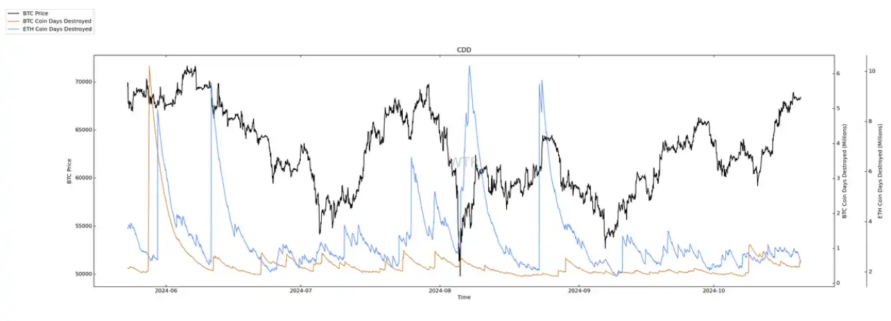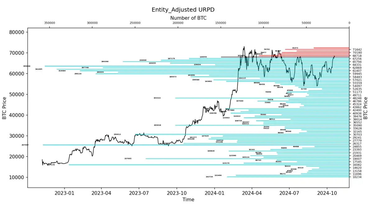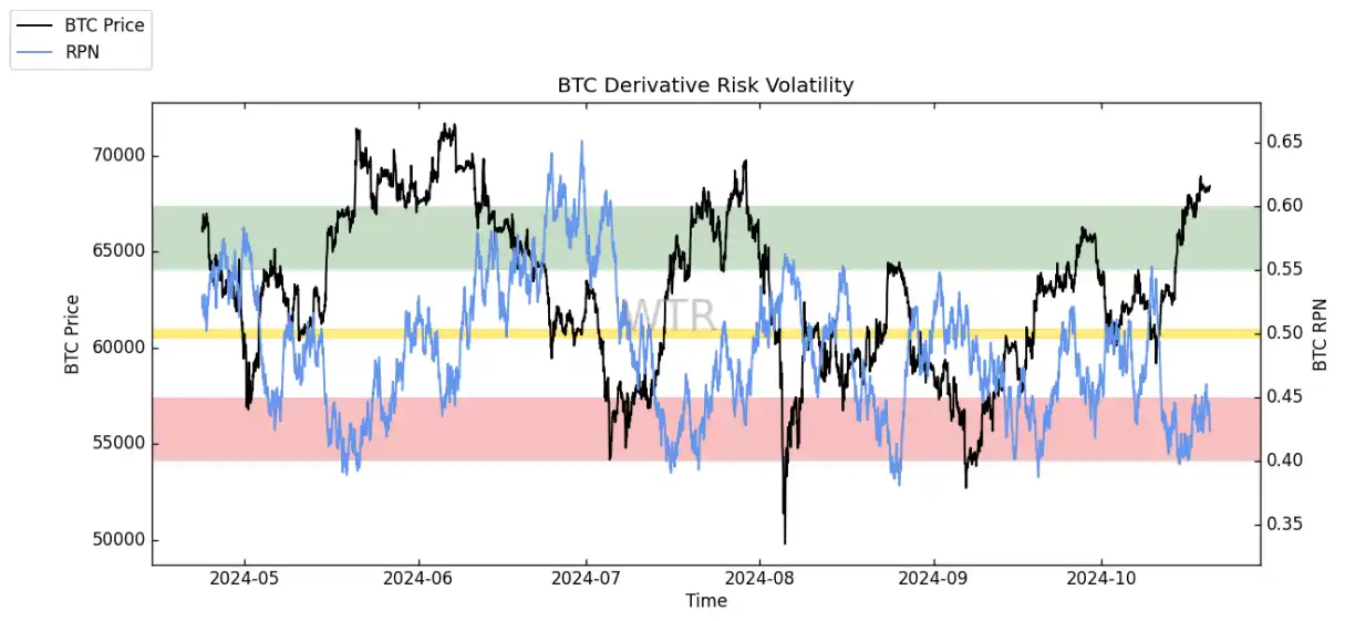 衍⽣品⻛险系数提⽰到达红⾊区域,再结合本周仍观测到在当前价位 68K 附近有⼤量的筹码换⼿和累积,预期在当前价位⼤幅度的回调概率较低。