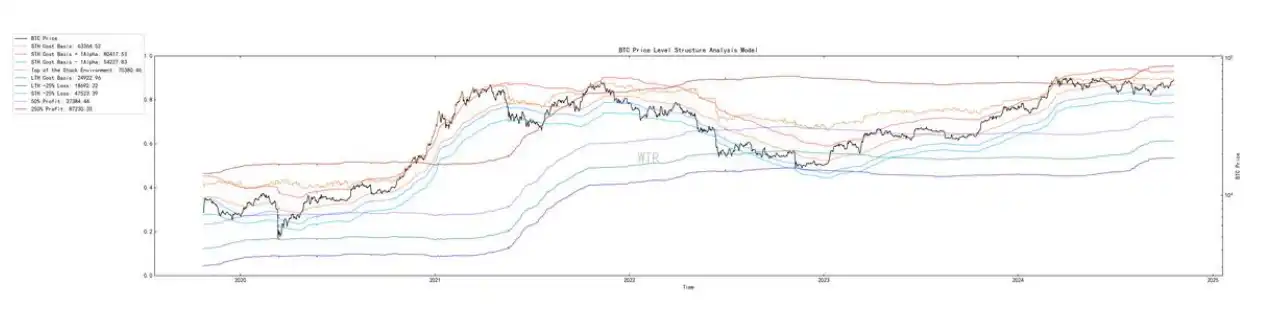 70000 美⾦附近是市场的重要阶段,也是⻓期参与者⼀定程度的盈利上限阶段。关乎这阶段性存量(市场内资⾦)的顶部。可能需要更多外部资⾦介⼊,才能让市场有所突破。