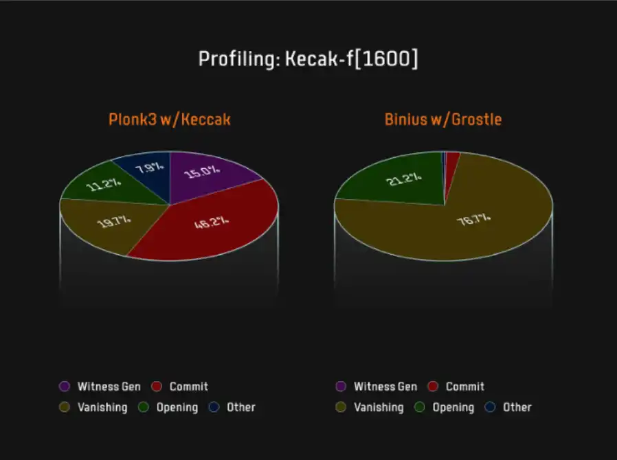 Binius 的整个价值主张是,可为 witnesses 使用最小的 power-of-two 域,因此只需根据所需来选择域大小。Binius 是“使用硬件、软件、与 FPGA 中加速的 Sumcheck 协议”的协同设计方案,可以以非常低的内存使用率来快速证明。Halo2 和 Plonky3 等证明系统有 4 个占用大部分计算量的关键步骤:生成 witness 数据、对 witness 数据进行承诺、vanishingargument、openingproof。以 Plonky3 中的 Keccak 和 Binius 中的 Grøstl 哈希函数为例,二者对应的以上 4 大关键步骤计算量占比情况如图 3 所示: