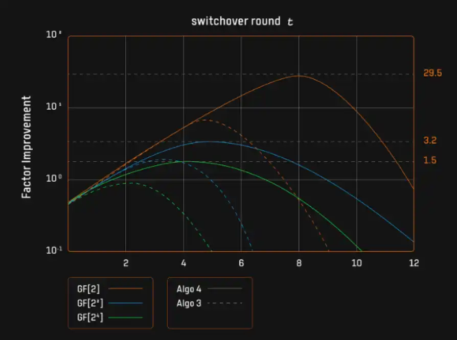 基于小域的 Sumcheck 协议的改进集中于切换轮次 t 的选择。切换轮次是指从优化算法切换回朴素算法的时间点,论文的实验表明,在最佳切换点时,改进因子达到最大值,随后呈现抛物线趋势。如果超过这一切换点,优化算法的性能优势减弱,效率下降。这是由于小域上的基域乘法与扩域乘法相比有更高的时间比率,因此在适当时机切换回朴素算法至关重要。