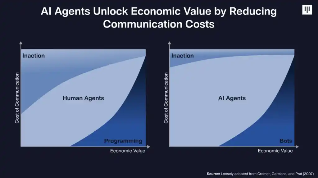 必须提前了解条件(因为你必须对它们进行编程)限制了机器人作为 agent 的实用性。然后,仅仅因为必须对机器人进行编程这一事实就意味着它对于那些不编程的人来说是遥不可及的。我们将转向 AI agent 建模为这些沟通成本的降低和相应的经济价值的释放。