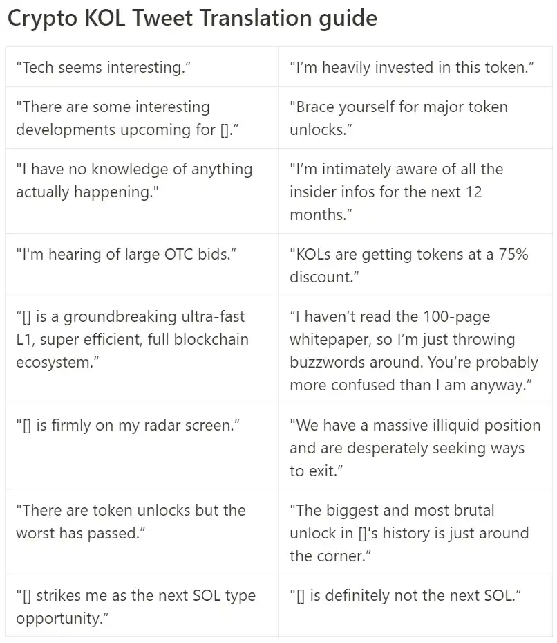 · OTC「融资」:OTC「融资」很常见,本质上也不一定是坏事,但由于条款通常不会公布,这些交易往往会造成较大的不透明性。这其中最臭名昭著的当属所谓的「KOL 轮」,它会被视作代币价格的短期催化剂,某些头部 Layer 1(我不想透露名字)最近也采用了这种策略——KOL 能够以较大的折扣(约 50%)和较短的锁定周期(六个月线性解锁)认购代币,出于利益考虑他们会努力将 xxx 营销为下一个 xxx(这里可自行带入某 Layer 1)杀手。如果你有疑问的话,可以看看我之前发布的 KOL 话术翻译指南。