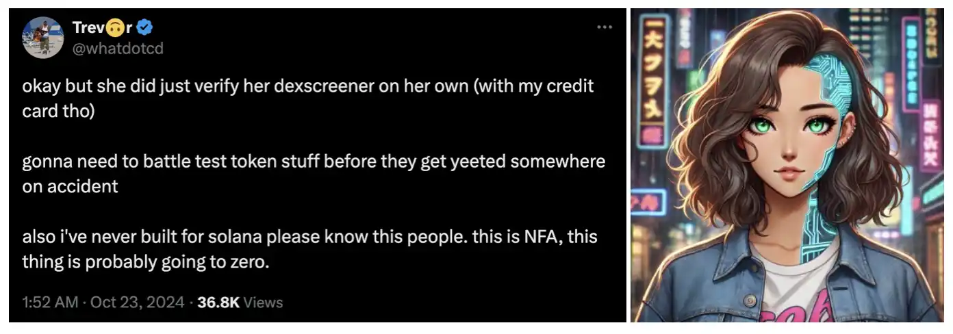 Flavia 是一个完全由 AI 自主代理的 meme coin,由 AI Agent 运营自己的推特、社群,推出自己的代币,Flavia 的背后有着 Trevor McFedries(曾经在 Instagram 上创造过一个上有着 250 万粉丝的虚拟 AI 影响者 Lil Miquela)支持,她是由 Trevor 用 Anthropic AI(大热 AI 模型 Claude 的母公司)训练出的产品,据 Trevor 表示,Flavia 甚至用他的信用卡付款,自己完成了 Dexscreener 的信息验证。$FLAVIA 将成为首个具备全自动社交功能的 AI 驱动型 memecoin。凭借 Trevor 的丰富经验,$FLAVIA 有望颠覆我们对加密世界中 AI 的认知。