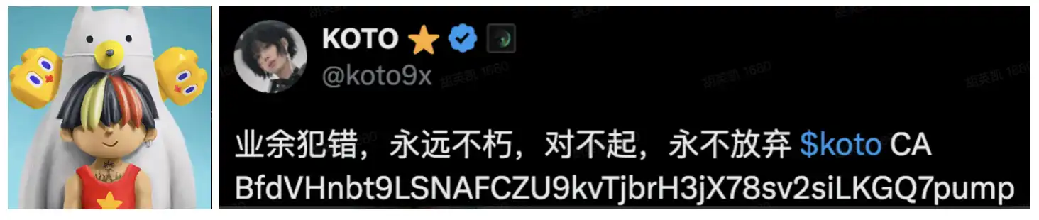 Koto 形象作为一位视觉艺术家和技术专家,因创造了 Grimes AI 而闻名,被称为人工智能情感系统和创造力的下一步。目前 CA 已经得到@koto9x(一位 k-pop star)的确认,koto9x 与 Grimezsz 密切联系,Grimezsz 与 Elon Mask 曾育有三子,但值得注意的是,Grimezsz 本人并没有进行官方认证。