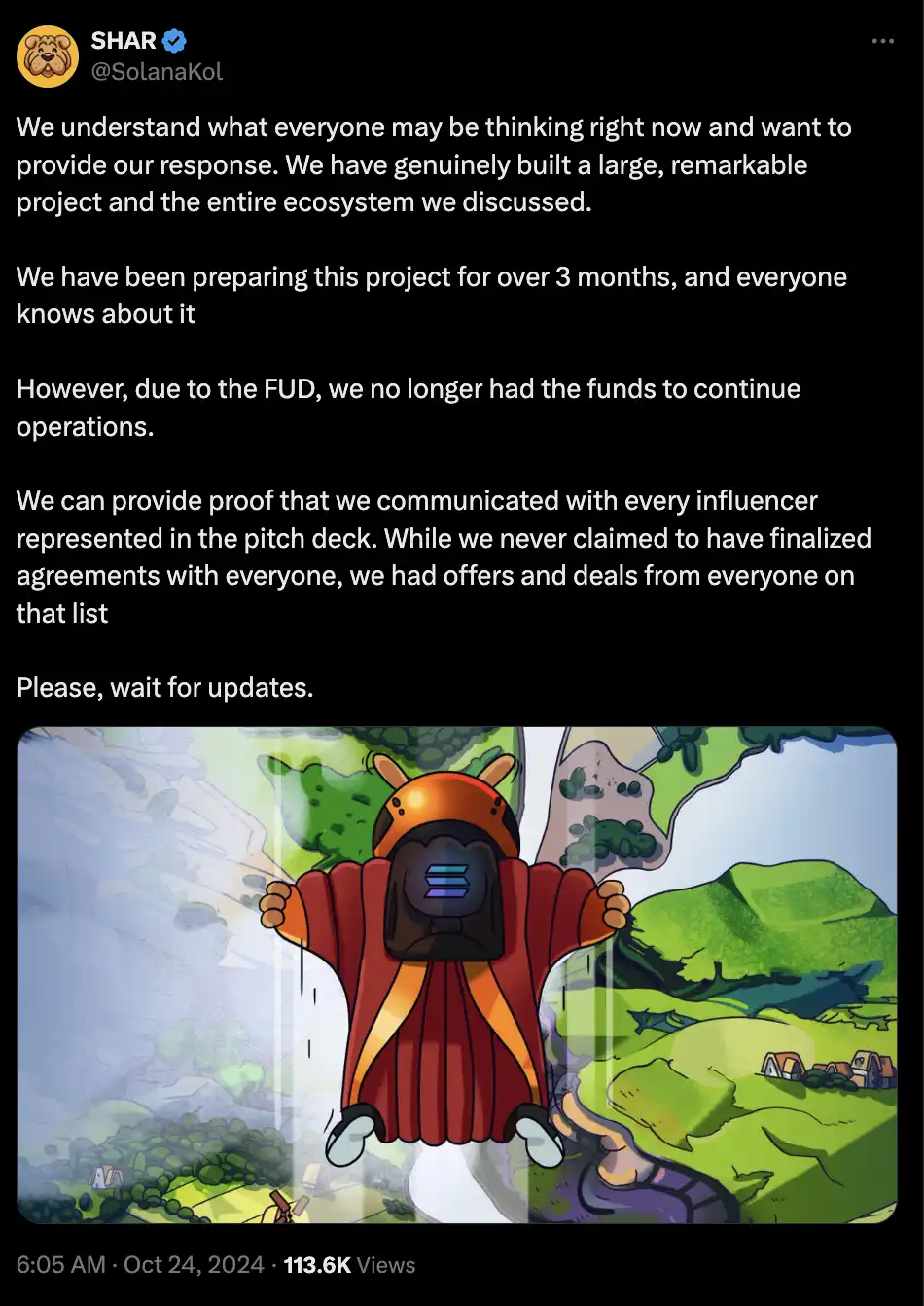 掏完池子后的不到一小时,SHAR 官推发布文章称由于 FUD,项目方不再有资金继续运营,并且表示他们能够提供证据,证明他们与 deck 中列出的每一位 KOL 进行了沟通,「虽然我们从未声称已与每个人达成最终协议,但我们收到了该名单上每个人的报价和交易。」结合 SHAR 官推的 handle 为 SolanaKol,颇有一种要将锅都甩到 KOL 身上的味道。