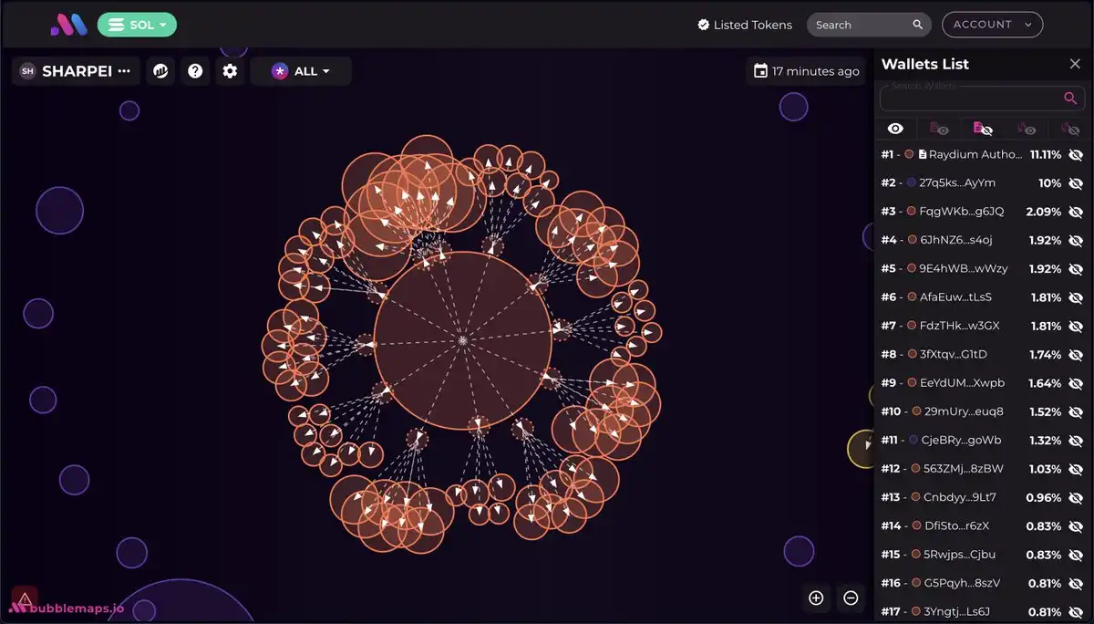 Bubblemaps称 60% 的 SHAR 被归集并分散到 100 多个地址,这意味着 SHAR 项目方为了操纵市场价格,通过在不同地址间转移代币,制造出交易量活跃的假象,吸引散户注意。
