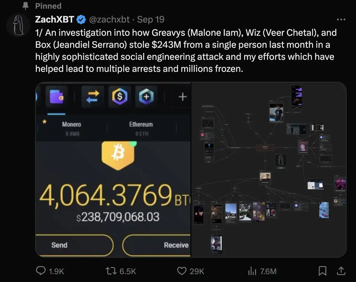 回到开头那起盗窃案,当 ZachXBT 在机场收到提示,发现 8 月 19 日发生的单个受害者被盗走 2.43 亿美元的线索时,这是他所追踪过的最大盗窃案之一。