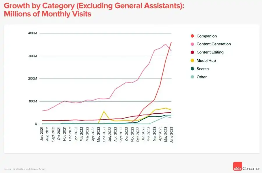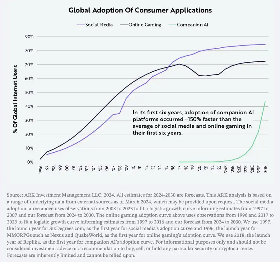 从 2018 年到 2023 年,AI 陪伴平台的月活跃用户数量增长了 30 倍,从不到 50 万用户增加到约 1500 万用户。现在,随着消费者娱乐用例的出现,AI 陪伴的采纳曲线可能会超过社交媒体和在线游戏在早期几年的增长速度。目前,AI 陪伴的采纳速度约是社交媒体和在线游戏在头六年内增长速度的 150%。