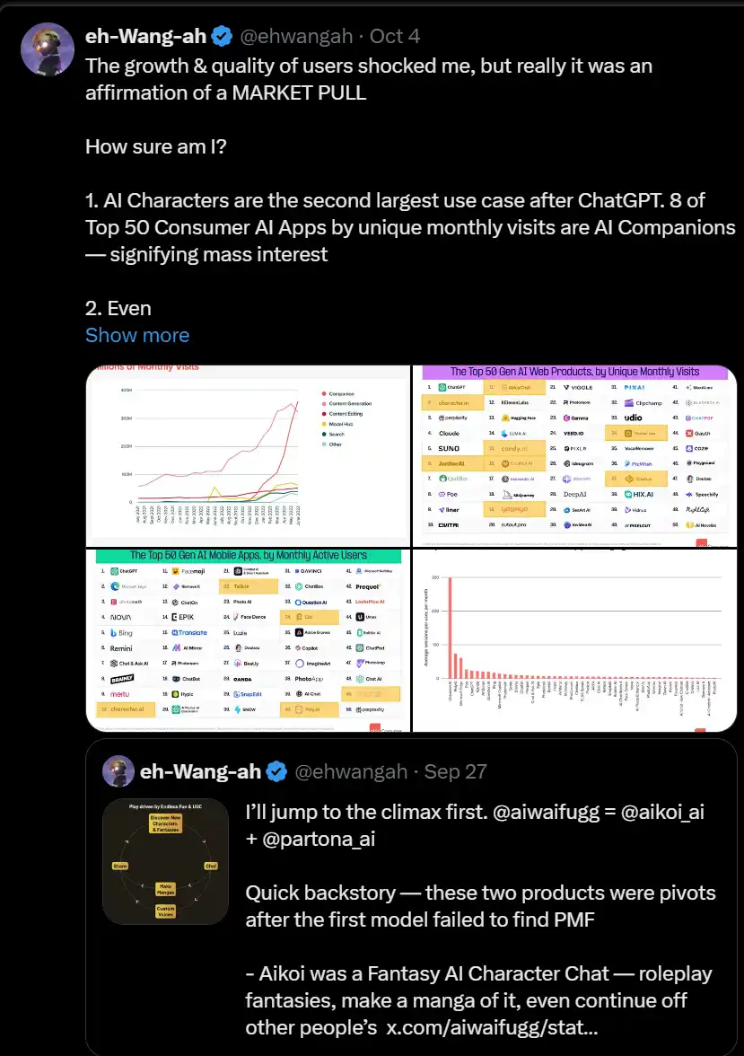 坦率地说,原因多种多样,其中最明显的就是成人内容——正如上面提到的,它在夺取 OnlyFans 流量方面的表现。我是说,像 @luna_virtuals 或 @truth_terminal 这样的大型语言模型(LLM)可以变得相当疯狂。如果你不相信我,可以去 aiwaifu.gg 试试看,你会明白的。