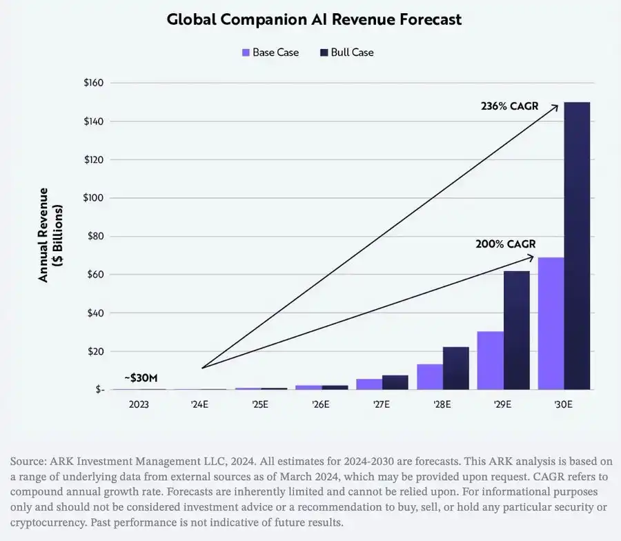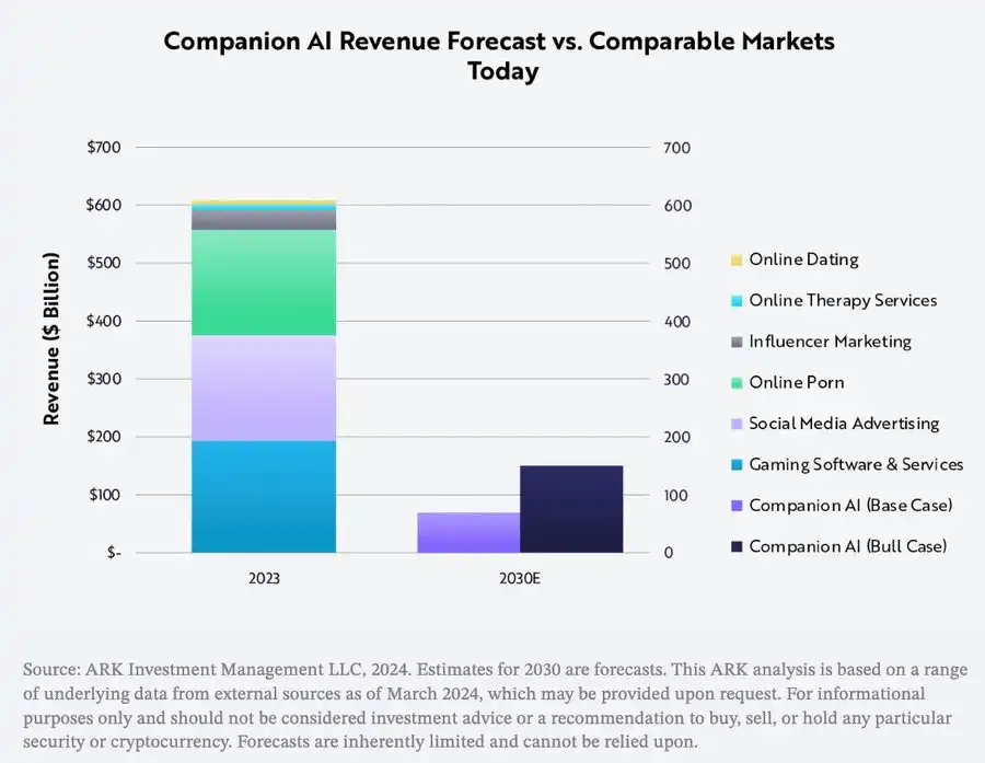 简单来说,原因在于 AI 虚拟伴侣可以涉足任何消费类软件市场的收入。它们在使用场景上多样化、可跨平台运行,且能够根据用户的互动进行自我进化——无论你能想到什么需求,AI 虚拟伴侣都能以更出色的方式满足。