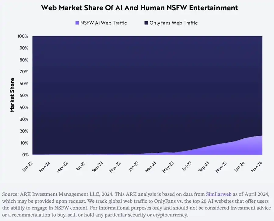 到 2024 年 3 月,NSFW AI 网站已从在线成人娱乐平台 OnlyFans 夺取了 14.5% 的市场份额,而一年前仅为 1.5%。
